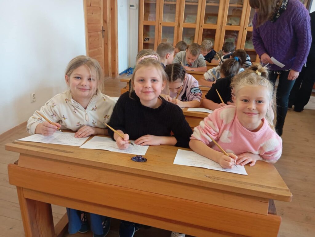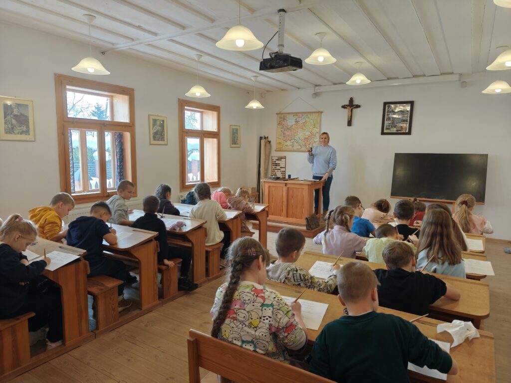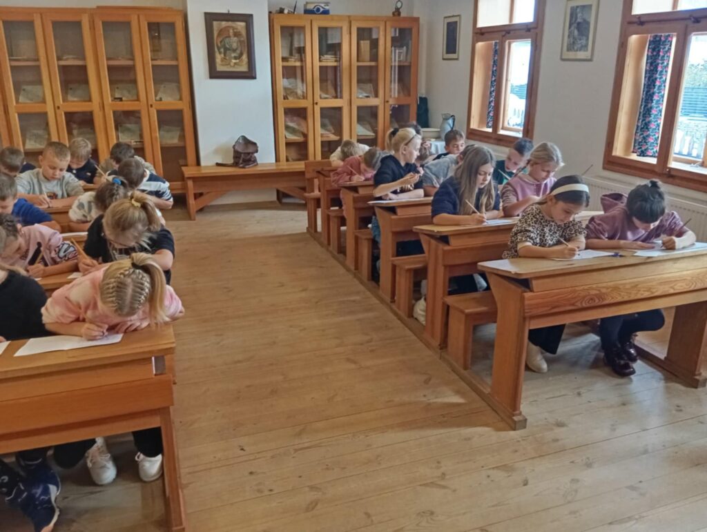 sala lekcyjna, ławki, przybory szkolne. Uczestniczyli w lekcji kaligrafii, pisali piórem nabierając
