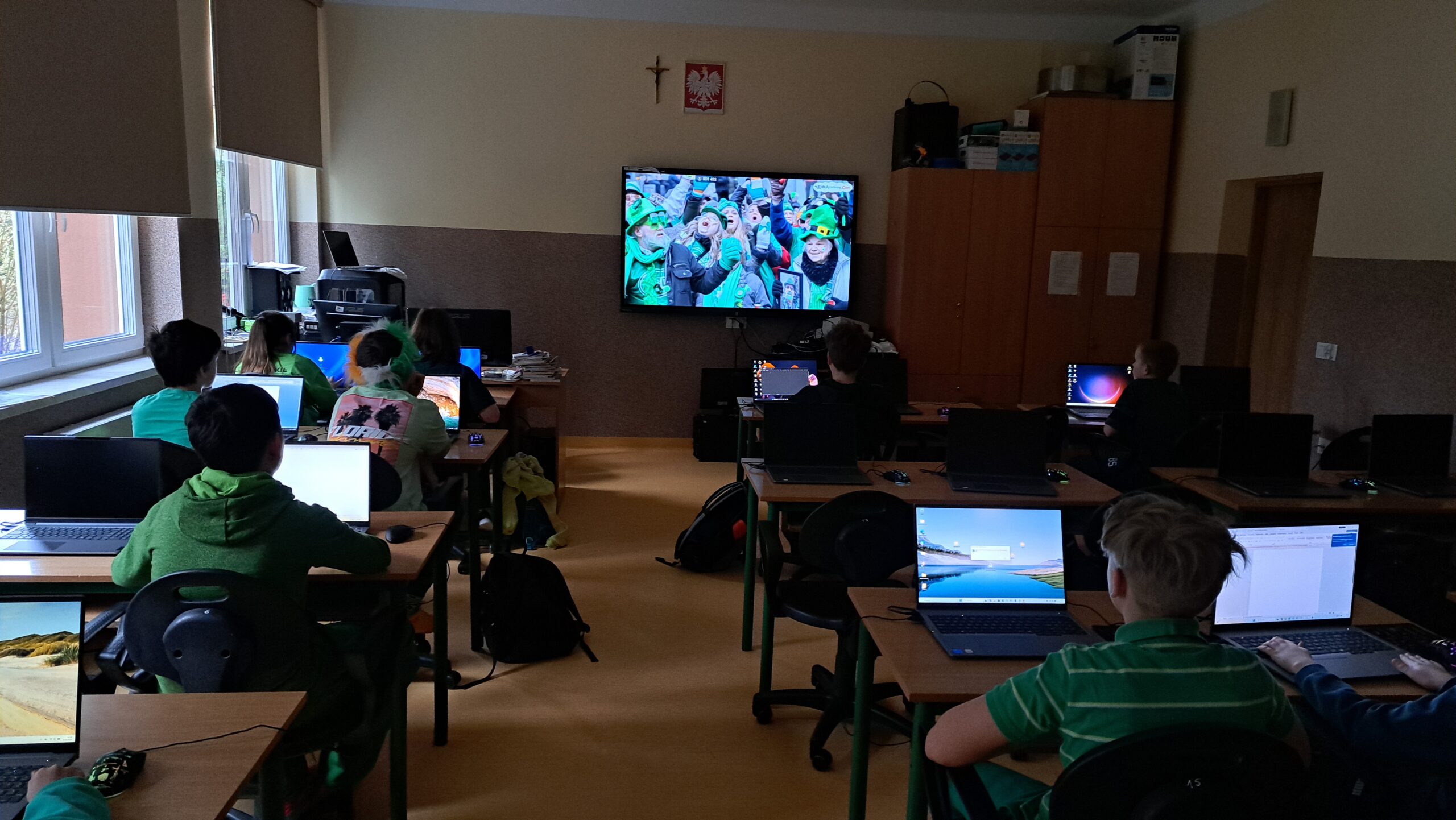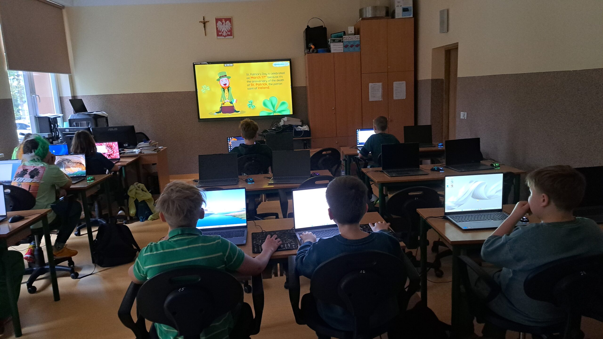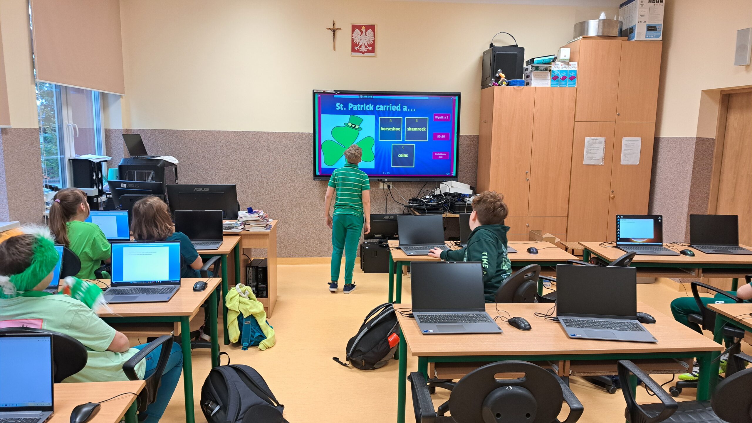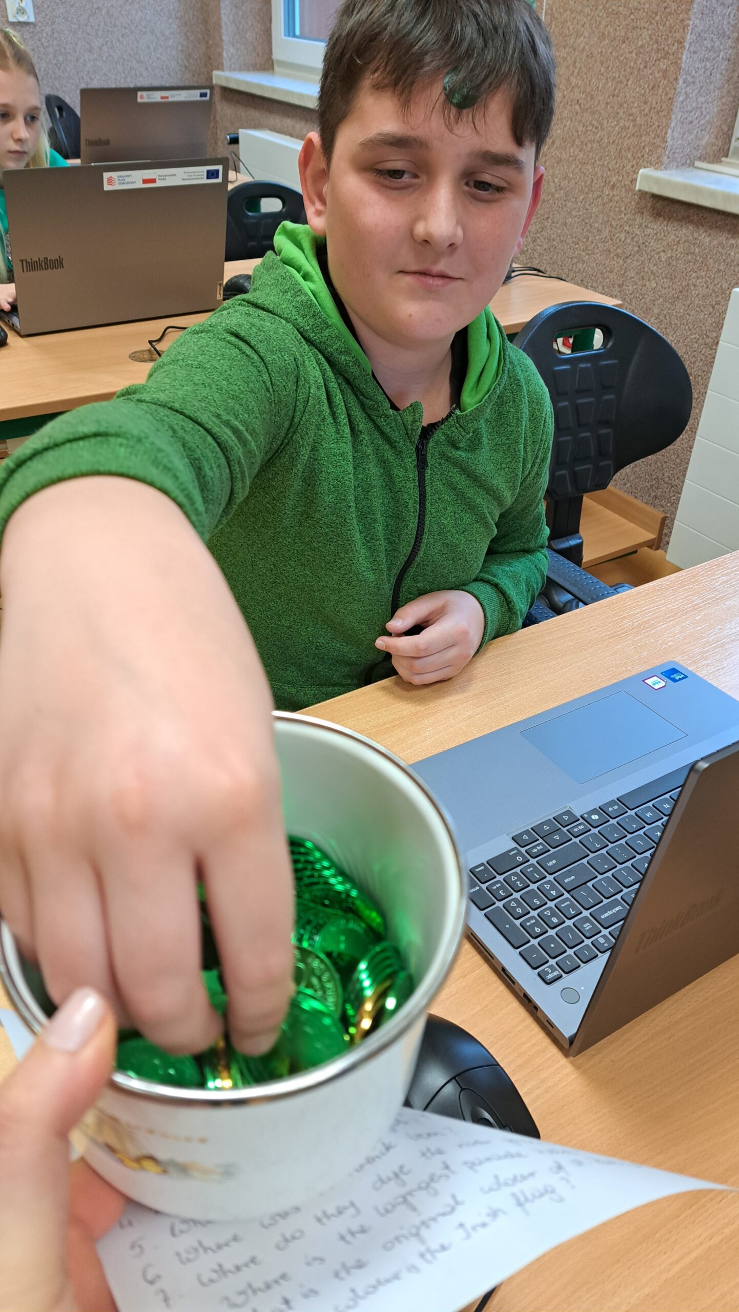 17. marca, uczniowie klas 4–6 świętowali w naszej szkole Dzień św. Patryka. Tego dnia w klasach dominował kolor zielony – chętni uczniowie przyszli ubrani właśnie w tym kolorze, nawiązując do irlandzkiej tradycji.