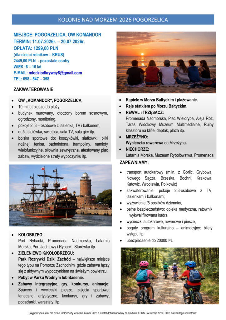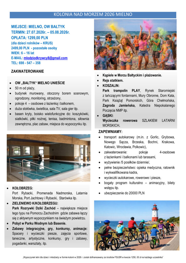 Informacja o nadchodzących koloniach letnich, organizowanych przez Stowarzyszenie Sportu i Rekreacji „Młodzi Odkrywcy” z Nowego Sącza.